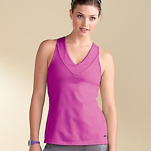 Add versatility to your workout wardrobe with our eco-fashionable V-neck top featuring an MP3 player pocket on back. Designed from earth-friendly recycled polyester and gathered in the back by a loose band of fabric for a stylish, sporty look. Built-in shelf bra for added support. 86% recycled polyester, 14% spandex. Machine wash. 24" from shoulder to hip.